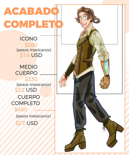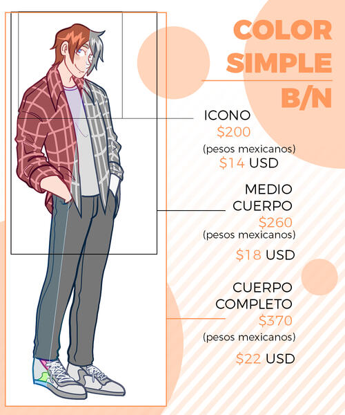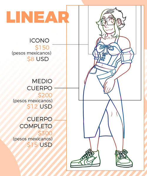 PRECIOS EXTRA:+Los precios pueden variar según la complejidad.+Un personaje extra equivale a un aumento del 80%+ del precio (depende de la complejidad).+Los fondos son colores planos, un fondo complejo equivale al aumento del 60%+ del precio (depende de la complejidad).+El NSFW se cobra un 20%+, más la tarifa por personajes extra si es más de uno.TÉRMINOS Y CONDICIONES:+Puedes usar el dibujo para lo que quieras, excepto si es con fines comerciales. LOS PRECIOS SON ÚNICAMENTE PARA USOS PERSONALES. En el caso de uso comercial, podemos hacer un contrato bajo otras condiciones y precios.+NO está permitido que EDITES, TRACEES o MODIFIQUES el arte final.+Tienes que pagar al menos el 50% antes de que empiece con la comisión y terminar el pago antes de entregar el archivo final.+ Se puede rembolsar un 80% ANTES de empezar a dibujar, si el dibujo ya ha sido empezado NO se pueden realizar reembolsos.+Una vez que la comisión esté terminada, te enviaré tu imagen (PNG, JPG) a través de un enlace de drive o por gmail.+Se permiten 2 cambios grandes en el proceso del boceto y 3 ajustes moderados en la parte del linear y color (para ajustar la paleta de colores). Cualquier cambio que exceda los permitidos será un costo extra.+El tiempo de espera es entre 3 días y 2 semanas, si tardo más, me comunicaré contigo y te mantendré informado.+Solo hago trabajos en mi estilo de dibujo.+Tengo derecho a rechazar una propuesta de comisión por cualquier motivo.+Tengo derecho a utilizar las ilustraciones con fines promocionales y para portafolio.+El pago es vía PAYPAL (USD) (O transferencia interbancaria para México)EN EL MOMENTO QUE ENVIES TU PEDIDO ASUMIRÉ QUE HAS LEÍDO Y ACEPTADO TODOS LOS TÉRMINOS Y CONDICIONES